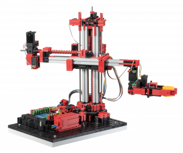Der 3-Achsroboter mit Greifzange positioniert schnell und präzise Werkstücke im dreidimensionalen Raum. Freiheitsgrade: Achse 1: drehen 180°, Achse 2: vor/zurück 90 mm, Achse 3: heben/senken 150 mm.