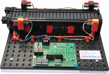 Transportband mit einer Länge von 275 mm transportiert Werkstücke mit einem Durchmesser von bis zu 29 mm. Mehrere Transportbänder können miteinander zu einem beliebig langen Transportband verbunden werden. Das Modell ist ideal kombinierbar mit "3-Achs-Roboter mit Greifzange"