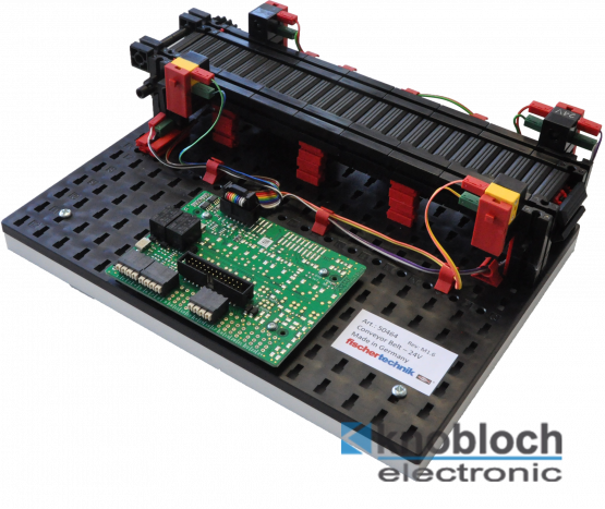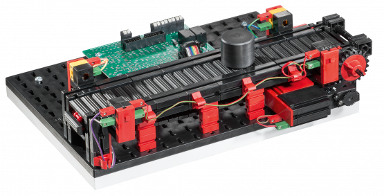 Transportband mit einer Länge von 275 mm transportiert Werkstücke mit einem Durchmesser von bis zu 29 mm. Mehrere Transportbänder können miteinander zu einem beliebig langen Transportband verbunden werden. Das Modell ist ideal kombinierbar mit "3-Achs-Roboter mit Greifzange"