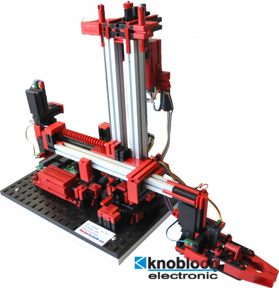 Der 3-Achsroboter mit Greifzange positioniert schnell und präzise Werkstücke im dreidimensionalen Raum. Freiheitsgrade: Achse 1: drehen 180°, Achse 2: vor/zurück 90 mm, Achse 3: heben/senken 150 mm. Das Modell ist ideal kombinierbar mit “Transportband“, “Stanzmaschine“, “Taktstraße“